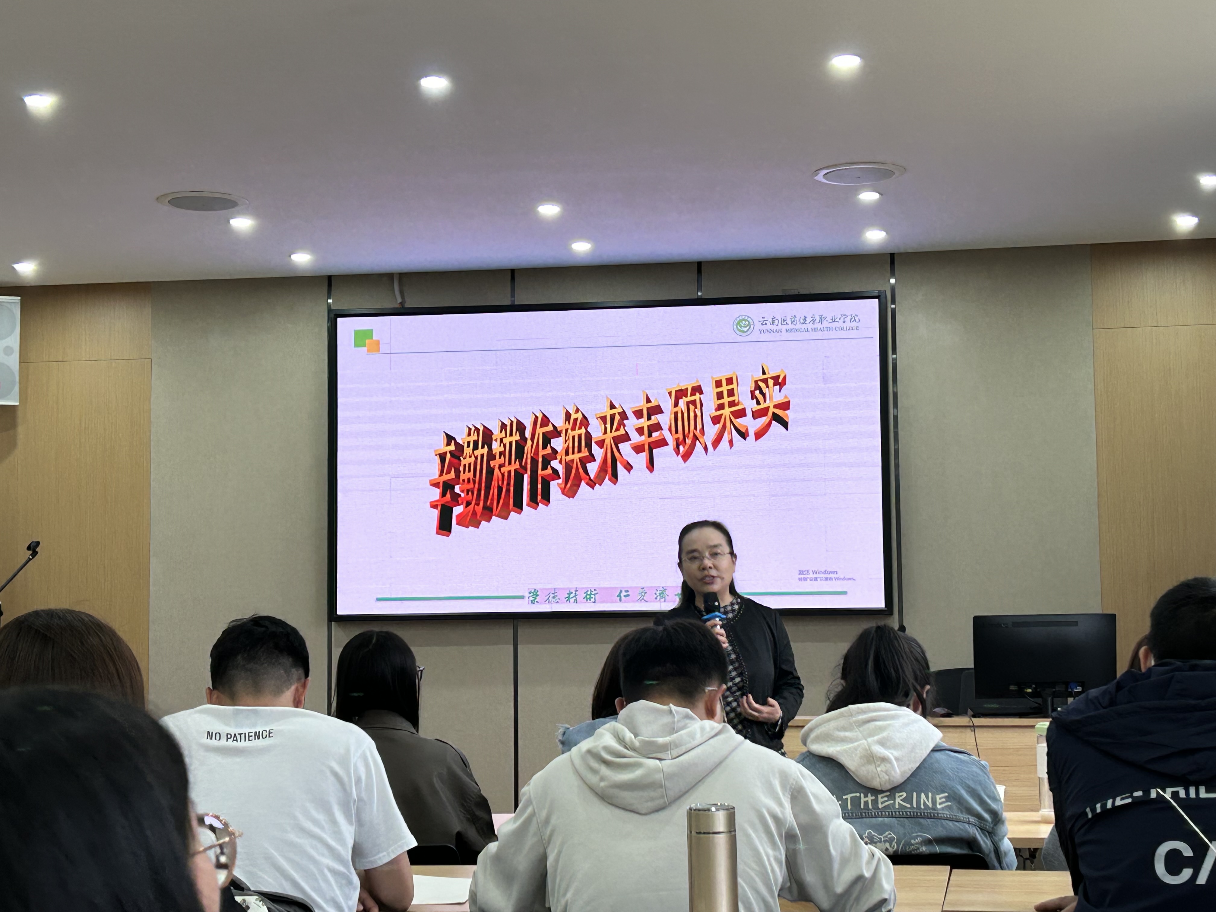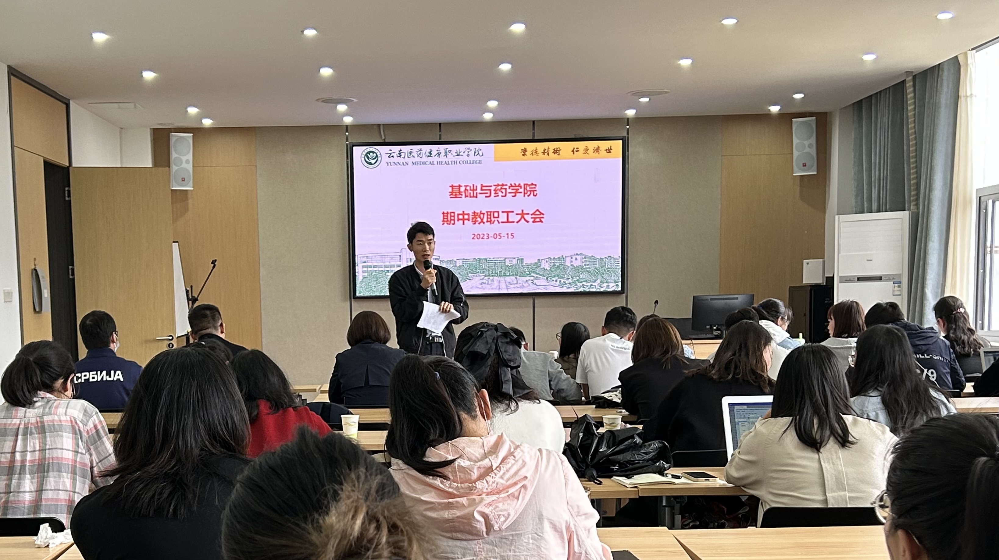 2023年5月15日,基础与药学院在海源校区康养中心三楼培训教室开展期中教职工大会,分为三个议程:学生科副科长黄玲艳汇报就业工作进展,杨绍坤副院长汇报期中教学检查情况,申丽娟院长安排近期工作。